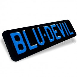 Plaque avant 80x300 mm, fond noir avec texte or ou chrome et écussons.